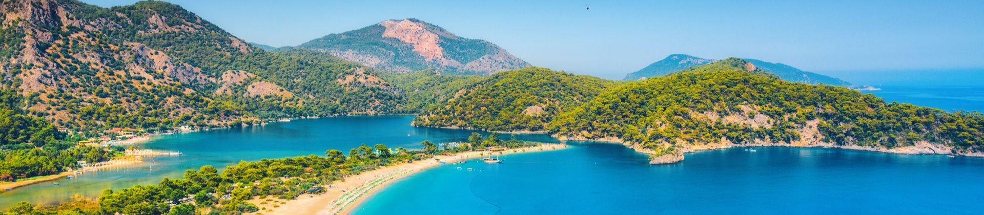 Ölüdeniz (Turkey) in general has a hot climate. Temperatures during the day are in the range from 15 °C (59 °F) in January to 32 °C (89 °F) in July. The highest night temperatures could be experienced in July with 22 °C (72 °F), the lowest in January with 5 °C (41 °F). Sea temperatures are in the following range: 17 °C (62 °F) in March to 27 °C (81 °F) in August. The least rainy month in Ölüdeniz is July with its 1 day of rain, the rainiest month is January, when it rains 12 days.